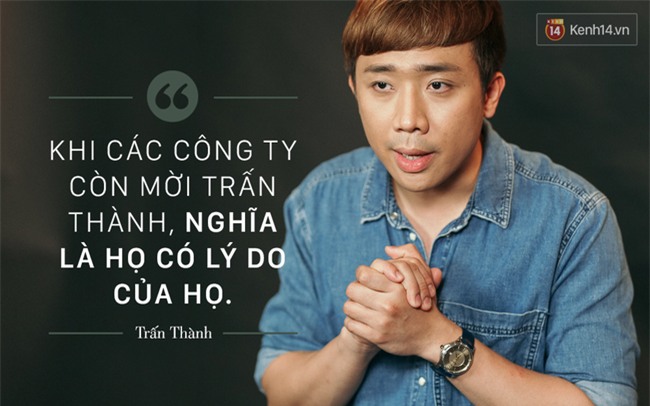 Tôi cũng không bao giờ dám khẳng định: "Trấn Thành sẽ không rơi vào trường hợp nhàm chán". Nhưng tôi nghĩ khi các công ty còn mời mình, nghĩa là họ có lý do của họ. Khi tôi nhận lời đều là những chương trình có chọn lọc, không lặp lại hình ảnh của chính mình và luôn cố gắng làm việc hết sức.