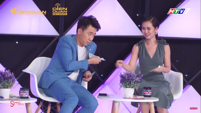 Trấn Thành lườm Võ Hạ Trâm và nói: "Sao tôi giống ngân hàng quá vậy". Sau đó, anh không ngần ngại móc túi ra lấy tiền đưa cho Võ Hạ Trâm.