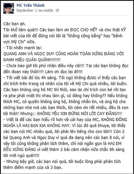 Tuy nhiên, những tâm sự của Trấn Thành nhanh chóng tạo nên một cuộc tranh luận khá khốc liệt trên trang cá nhân của anh. Những người yêu mến Phương Mỹ Chi tất nhiên rất ủng hộ "tâm thư" của MC nhưng không ít ý kiến lại cho rằng anh quá thiên vị cô nhóc. Cuối cùng, để trấn an dư luận và khiến mọi người hiểu rõ về mình hơn, Trấn Thành quyết định viết một tâm thư khác để "mổ xẻ" những điểm mạnh - yếu của từng thí sinh lọt vào đêm chung kết Giọng hát Việt nhí. Anh không tiếc lời khen Quang Anh bản lĩnh: "Điểm nổi trội hơn hết là biết làm chủ sân khấu, cách diễn đạt bài hát rất tốt, nhanh nhẹn, thông minh làm khán giả cảm thấy rất hưng phấn và bị lôi cuốn". Còn Ngọc Duy được Trấn Thành đánh giá là xuất sắc bởi: "Giọng hát có âm vực khá rộng, xuống thấp và lên cao dễ dàng. Bên cạnh đó, có nhiều tài lẻ, biểu diễn vô cùng sinh động".