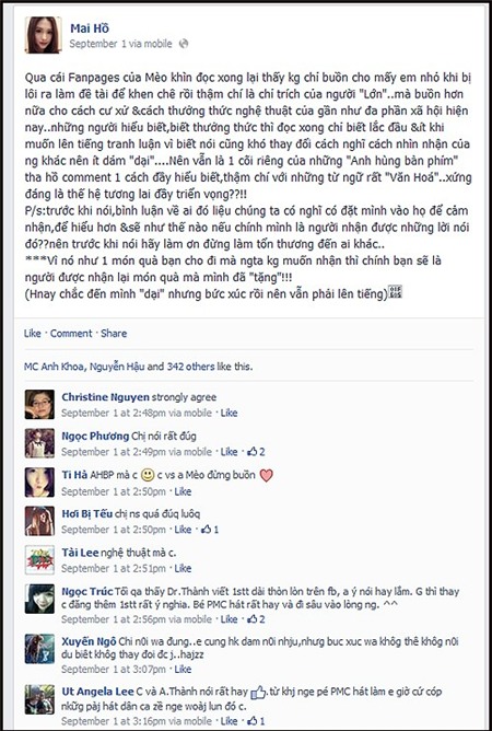 - Tôi viết bài đó lúc 4h sáng. Tôi ngủ không được vì thấy các bạn chỉ trích trên trang cá nhân của tôi về Mỹ Chi (MC - pv) quá nhiều, tôi buồn. Các bạn không ủng hộ MC thì thôi, sao lại chỉ trích con bé rồi tạo ra phe phái miệt thị nhau làm gì, có đáng hay không? Nếu không thích MC, có quyền không ủng hộ, không nhắn tin, và ủng hộ cho những bạn nhỏ mà các bạn thích, tôi cảm ơn rất nhiều, đều là con tôi thôi! Nhưng không yêu xin đừng nói lời cay đắng!