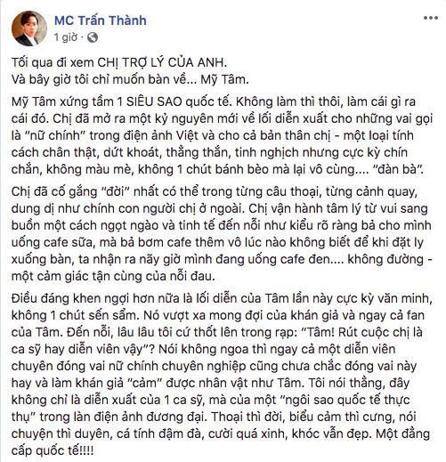 Mới đây, sau khi đi xem bộ phim Chị trợ lý của anh, ngay lập tức trên trang cá nhân MC Trấn Thànhđã đăng tải trạng thái khá dài dài bày tỏ sự kính nể Mỹ Tâm. Đặc biệt, nam MC khẳng định: "Mỹ Tâm xứng tầm 1 SIÊU SAO quốc tế. Không làm thì thôi, làm cái gì ra cái đó. Chị đã mở ra một kỷ nguyên mới về lối diễn xuất cho những vai gọi là 'nữ chính' trong điện ảnh Việt và cho cả bản thân chị - một loại tính cách chân thật, dứt khoát, thẳng thắn, tinh nghịch nhưng cực kỳ chín chắn, không màu mè, không 1 chút bánh bèo mà lại vô cùng.... 'đàn bà'".