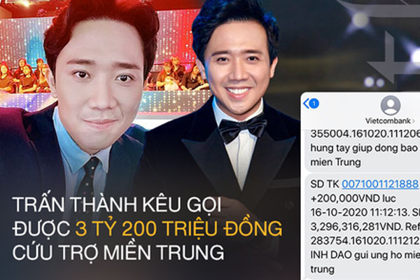 Sau 2 ngày kêu gọi, hiện Trấn Thành thông báo đã nhận được 5,7 tỷ đồng tiền quyên góp cứu trợ cho đồng bào miền Trung lũ lụt từ các nhà hảo tâm. Tuy nhiên, Trấn Thành cho biết vì đang bận quay phim cho dịp Tết Nguyên Đán nên kế hoạch đến miền Trung trong ngày 19/10 tới sẽ không thực hiện được.