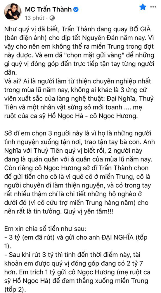 Như quý vị đã biết, Trấn Thành đang quay Bố Già (bản điện ảnh) cho dịp Tết Nguyên Đán năm nay. Vì vậy cho nên em không thể ra miền Trung trong đợt này được. Và em đã "chọn mặt gửi vàng" để những gì quý vị đóng góp đến trực tiếp tận tay từng người dân. Và ai? Ai là người làm từ thiện chuyên nghiệp nhất trong mùa lũ năm nay, không ai khác là 3 ứng cử viên xuất sắc của làng nghệ thuật: Đại Nghĩa, Thuỷ Tiên và một nhân vật sừng sỏ mới toanh .... mẹ ruột của ca sỹ Hồ Ngọc Hà - cô Ngọc Hương. Sở dĩ em chọn 3 người này là vì họ là những người tình nguyện xuống tận nơi, trao tận tay bà con. Anh Nghĩa với Thuỷ Tiên quý vị biết rồi, 2 người này đang là quán quân với á quân của mùa lũ năm nay. Còn riêng cô Ngọc Hương sở dĩ Trấn Thành chọn để gửi tiền cho cô là vì quê cô ở miền Trung, cô là người chuyên đi làm thiện nguyện, và có trong tay rất nhiều thậm chí là chi tiết những hộ nghèo ở dưới đó (vì cô cứu trợ miền Trung hàng năm) cho nên rất là tin tưởng. Quý vị yên tâm! Em xin chia số tiền như sau: - 3 tỷ (em đã rút) và gửi cho anh ĐẠI NGHĨA (tốp 1). - Sau khi rút 3 tỷ thì tính đến thời điểm này, tài khoản em được quý vị đóng góp đang có 2 tỷ 7 hơn. Em trích 1 tỷ gửi cô Ngọc Hương (mẹ ruột ca sĩ Hồ Ngọc Hà) để đem thẳng xuống miền Trung (tốp 2). - Phần còn lại từ hôm nay đến hết ngày mai em sẽ gửi cho Thuỷ Tiên (tốp 3). Thuỷ Tiên đang chuẩn bị ra miền Trung đợt 2 nên em gửi em nó luôn. Như vậy, quý vị yên tâm rồi hen. Tụi em làm từ thiện bằng cả tấm lòng. Tuyệt đối không ăn không cắn 1 đồng nào trong này. Ai ăn mớ tiền này sống đâu có thọ. Và tụi em hoàn toàn đủ khả năng để kiếm ra số tiền như thế này nên đừng ai nói ra nói vào tội nghiệp tụi em. Ai tin tưởng thì gửi gắm ở em, chứ em không dụ dỗ hay ép buộc ai cả. Những lời bàn tán thị phi trong lúc này em nghĩ không nên. Thay vì mở miệng ra nói một điều gì xấu, ta hãy xắn tay áo lên làm một điều gì tốt đi. Em cảm ơn quý vị đã tin yêu em và các anh chị em nghệ sĩ! Và hãy tiếp tục vì miền Trung thân thương và khốn khổ của chúng ta trong mùa lũ về. Họ đang cần mình. |