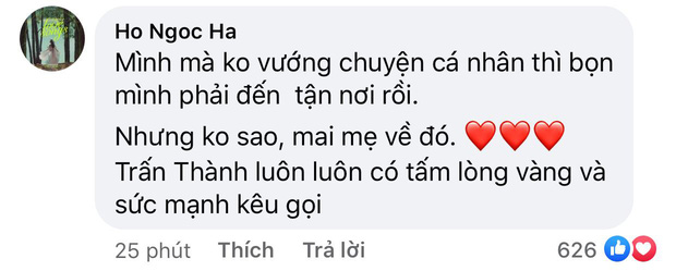 Dưới phần bình luận, Hà Hồ gây chú ý khi hé lộ lý do không thể đi cứu trợ miền Trung lúc này: "Mình mà không vướng chuyện cá nhân thì bọn mình phải đến tận nơi rồi. Nhưng không sao, mai mẹ về đó. Trấn Thành luôn luôn có tấm lòng vàng và sức mạnh kêu gọi". Khán giả đều thông cảm vì biết rằng nữ ca sĩ sắp sinh con nên không thể di chuyển đến vùng lũ.