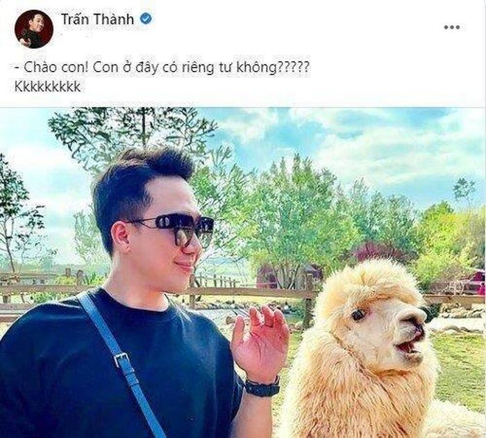 Cụ thể, anh đăng hình ảnh đang tạo dáng bên một chú cừu và đăng kèm dòng caption khá hài hước: "Chào con! Con ở đây có riêng tư không?". Chia sẻ của Trấn Thành đã nhận được rất nhiều tương tác mặt cười - haha trong bài viết.