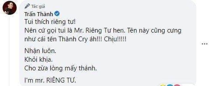 Đáng chú ý hơn, bên dưới phần bình luận, Trấn Thành đã khẳng định và đặt thêm cho chính mình biệt danh mới - Mr. Riêng Tư. Trấn Thành bày tỏ: "Tui thích riêng tư! Nên cứ gọi tui là Mr. Riêng Tư hen. Tên này cũng cưng như cái tên Thành Cry áh! Chịu! Nhận luôn. Khỏi khịa. Cho vừa lòng mấy thánh. I'm mr. RIÊNG TƯ".