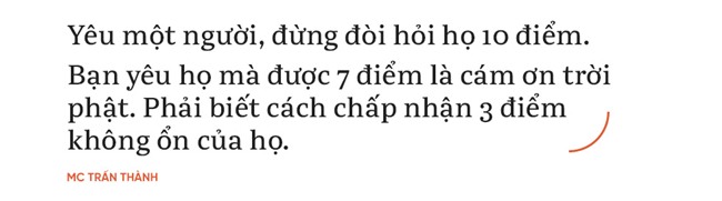 Có lẽ đây mới chính là con người tôi tìm kiếm ở anh trong buổi nói chuyện này: giản dị, chân phương như một người bạn đang tâm sự chứ không phải một MC hoạt ngôn, tinh ranh và nhiều nghĩ ngợi trong câu chữ. "Sự chân thật sẽ là điều đặc biệt nhất trong đám cưới của tôi" – cuối buổi nói chuyện, Trấn Thành quay sang nói với tôi câu này. Đây cũng là điều chốt lại khiến tôi cảm nhận được cái tình cảm của anh dành cho bạn gái trong mối quan hệ này chính là gói gọn trong hai từ "chân thành" ấy.