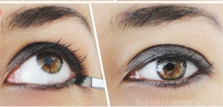 Trước khi đánh phấn mắt, phái đẹp sử dụng bút kẻ mắt màu đen để vẽ đường viền. Đường viền chì đậm sẽ tạo độ sâu và giúp đôi mắt trông dài, to hơn. Dùng cọ mềm để tán đều chì kẻ mắt như hình vẽ.