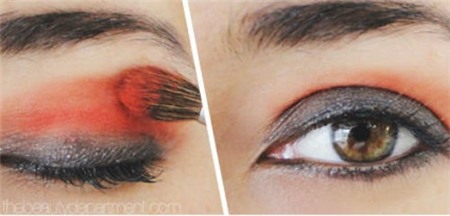Tiếp đến, bạn gái đánh phấn đỏ lên bầu mắt trên, dùng cọ mềm tán đều vào kéo dần về phía đuôi mắt.
