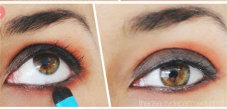 Dùng bút kẻ mắt tiếp tục vẽ 2/3 đường viền chân mi dưới, kéo chì hơi chếch về đuôi mắt và nối chúng với mi mắt trên rồi tô đậm khoảng đuôi giữa hai mí mắt.