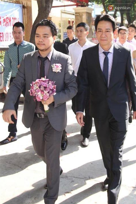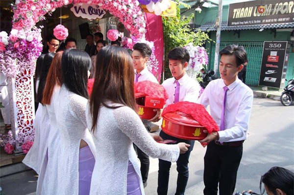 Đúng 8h30, chú rể Nguyễn Hoàng Duy trong bộ vest đen lịch lãm, hạnh phúc cùng bố mẹ và dàn phụ rể xuất hiện với lễ vật tươm tất cho lễ bái gia tiên. Vì muốn lễ rước dâu diễn ra trong không khí ấm cúng, Trang Nhung hầu như không mời bạn bè và đồng nghiệp đến buổi lễ. Cô muốn chia sẻ niềm vui này cùng mọi người tại tiệc cưới tại nhà hàng sang trọng diễn ra vào chiều nay.