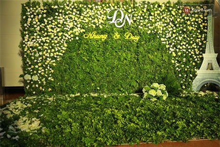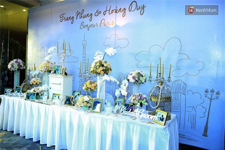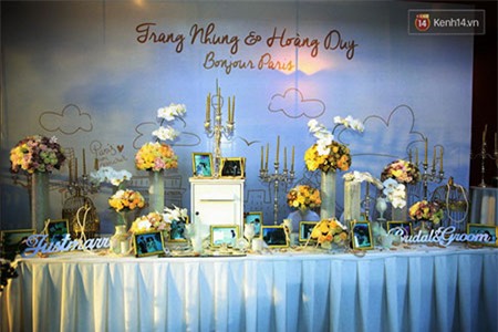 Cũng như buổi tiệc tại TP.HCM, Trang Nhung cho bài trí những phụ kiện, hoa nến và khung ảnh trên các bàn hai bên lối đi |