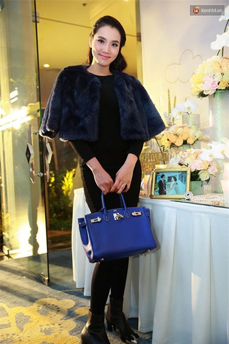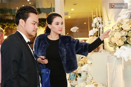 Vợ chồng Trang Nhung đến khá sớm để chăm chút cho những công đoạn trang trí trước đêm tiệc. Thời tiết tại Hà Nội khá lạnh nên Trang Nhung chọn áo lông để giữ ấm |