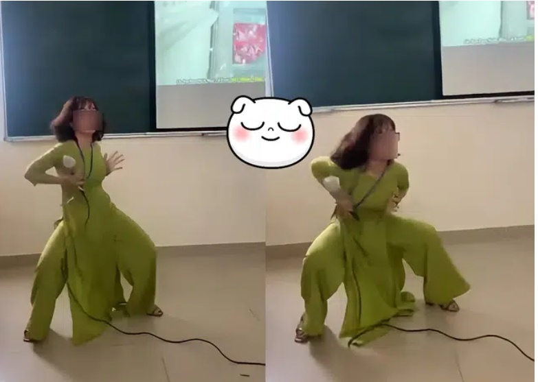 Theo người chia sẻ, đây là tiết học cuối cùng của môn tiếng Anh. Trong đoạn video chỉ hơn 30 giây, cô giáo trong bộ áo dài truyền thống vừa cầm mic hát vừa nhảy "sexy". Phía sinh viên bên dưới liên tục khen và động viên cô giáo của mình: "dễ thương quá cô ơi", "nhảy lại đi cô", cùng tiếng vui cười và vỗ tay hoan nghênh.