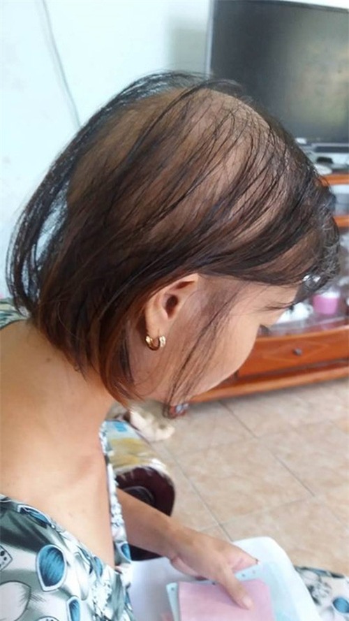 Bà Tú bên bộ tóc đã rụng, nghi do nhiễm chất độc từ việc ngộ độc thuốc diệt cỏ paraquat. Ảnh: PV |