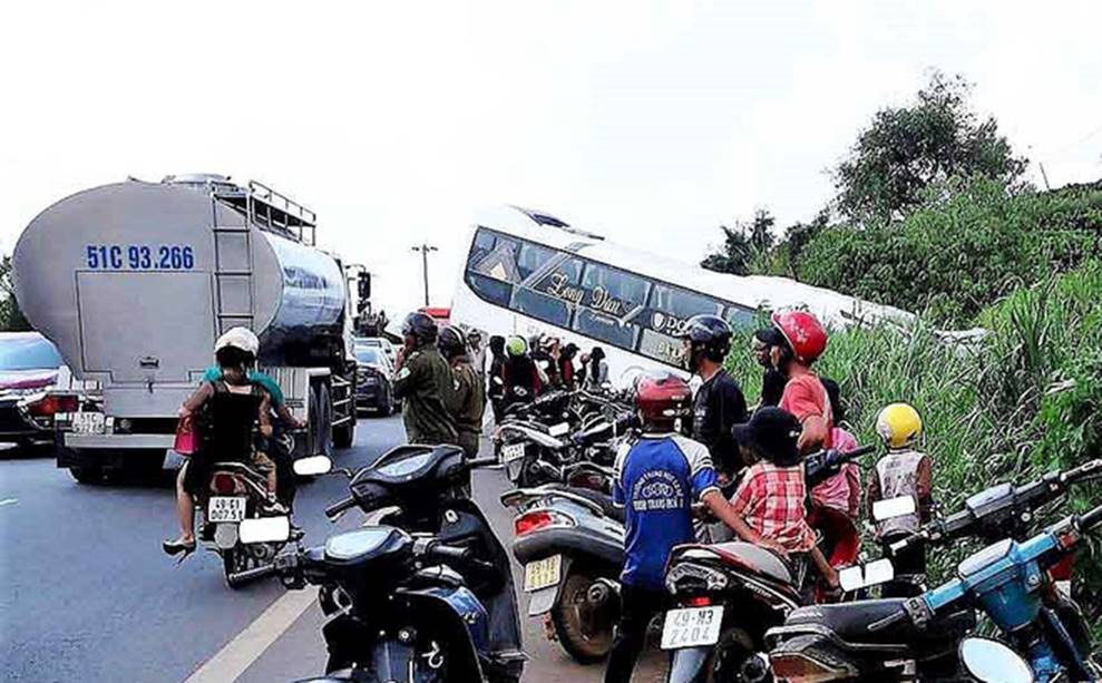 Đang đổ dốc vào cua, chợt phát hiện đám đông bao vây một chiếc ô tô ngay giữa đường, tài xế xe khách phải đánh lái qua bên trái, cắm đầu xuống hục sâu chừng 5m ven Quốc lộ 20.