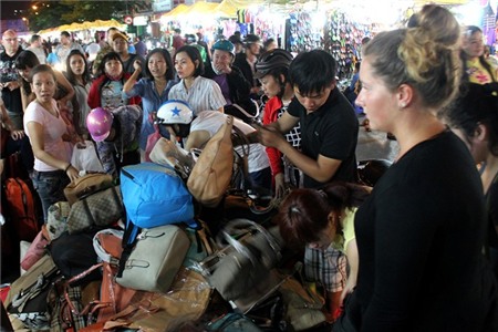 Chỉ sau vài phút rao bán, cửa hàng đã thu hút đông đảo khách. Nhiều người đang vui chơi ở khu trung tâm thành phố, khách đi đường ngang qua đây cùng tranh nhau bới tung đống túi xách giảm giá, cố tìm cho mình chiếc ưng ý. |