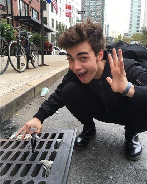 Chàng trai này đang giả vờ vẫy tay tạm biệt chiếc di động sắp rơi vào miệng cống.