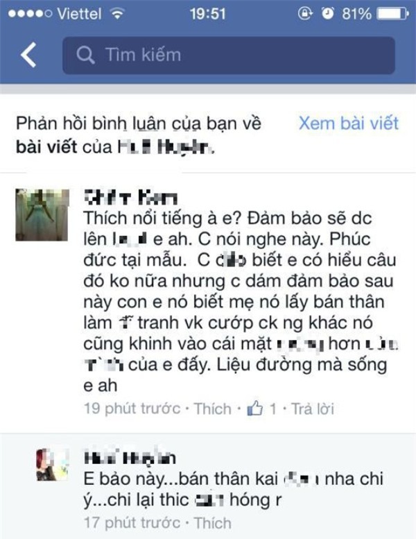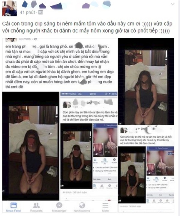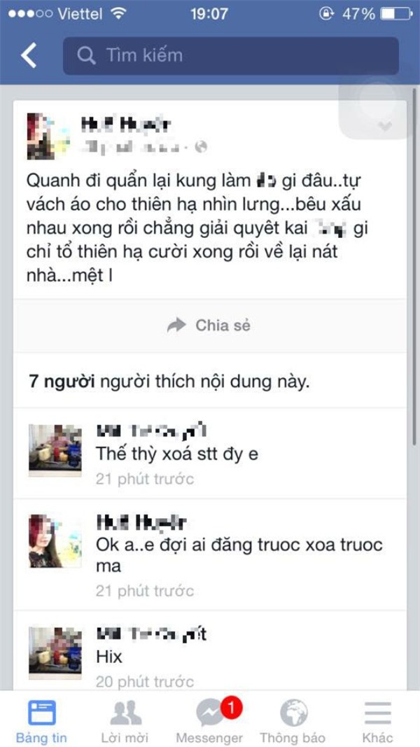 Phát hiện chồng cặp bồ, chị L.T chia sẻ trên một hội kín. “...Mình mới phát hiện ra thì có lẽ hơi muộn quá. Dù biết chồng mình “thối nát” nhưng mình điên máu quá các mẹ ạ. Hết tin nhắn mùi mẫn, đến ảnh không mặc gì trong điện thoại rồi thì clip chúng “...” với nhau,... Giờ là post hẳn ảnh lên facebook, bẩn thỉu từ cái tên, cái tiếng bẩn đi... Mình thực sự thấy khổ và bế tắc, mọi thứ như muốn nổ tung trong đầu chỉ vì 1 gã đàn ông quá khốn mang tiếng chồng”, facebook L.T chia sẻ.