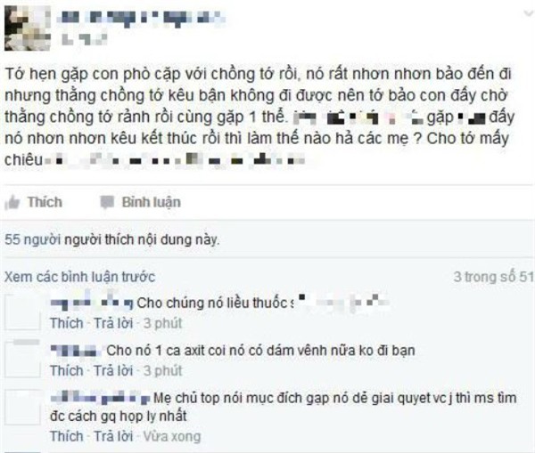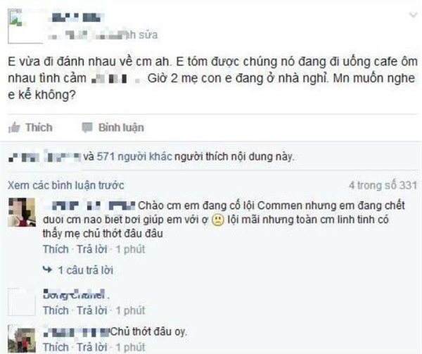 Một mẹ khác có facebook tên T.N cũng vào “báo cáo” tình hình: “Em vừa đi đánh nhau về các mẹ ạ. Em tóm được chúng nó (chồng và người tình – PV) đang đi uống cafe ôm nhau tình cảm”.
