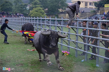Một số khán giả cố tình trốn lực lượng an ninh trèo rào vào bên trong bị trâu chọi thua trận lùa phải nhảy lên hàng rào. |
