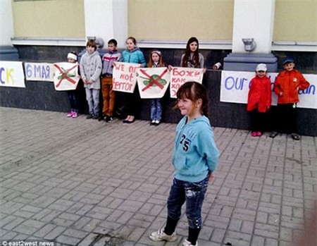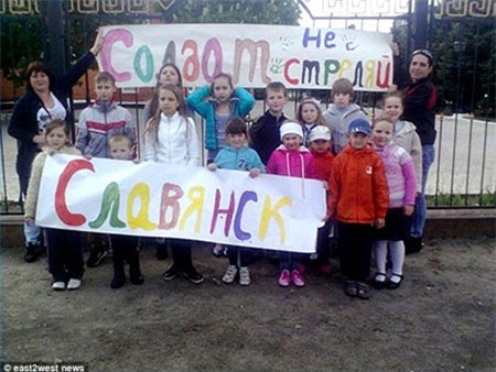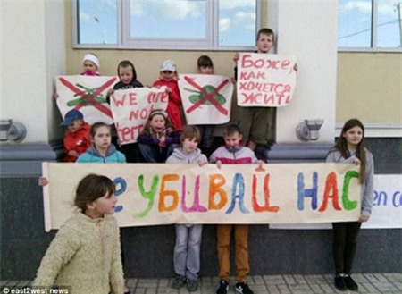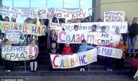 Trẻ em Đông Ukraine biểu tình, giương cao các khẩu hiệu cầu xin binh sĩ nước này rút lui khỏi khu vực. |