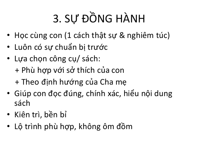 Cha mẹ cần theo sát để nhận biết và đánh giá sự tiến bộ hàng ngày của trẻ, có lịch trình học tập tuần tự từ thấp đến cao. Tuyệt đối không cùng lúc học nhiều chương trình. Đặc biệt, không nên so sánh con với các bạn cùng trang lứa mà tạo áp lực học tập cho con. Thành tích của trẻ ngày hôm nay là sự tiến bộ hơn so với ngày hôm qua chứ không phải trên cơ sở so sánh với trẻ khác.