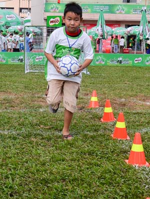 Lần đầu làm quen với những trò chơi cảm ứng: chuyền bóng, sút bóng, các cậu bé cô bé lại chạy ùa về khoe với các thầy, cô phụ trách chiến lợi phẩm là những gói MILO be bé xinh xinh.