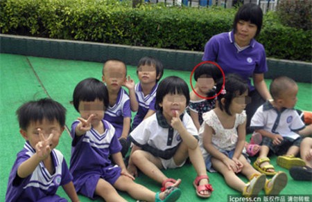 Bé Zhong Miaolin (khoanh tròn đỏ) trong một bức ảnh cô giáo và các bạn học.