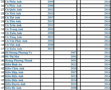 Thậm chí, rất nhiều cháu có họ tên trùng nhau hoàn toàn, chỉ khác mỗi năm sinh. Ví dụ: Có 2 cháu mang họ tên Cù Tuấn Anh nhưng một cháu sinh năm 2008, cháu kia sinh 2013.
