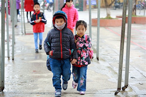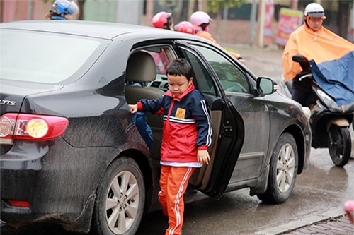 Nhiệt độ buổi sáng xuống thấp kèm theo mưa khiến không ít trẻ nhỏ vất vả theo cha mẹ tới trường.