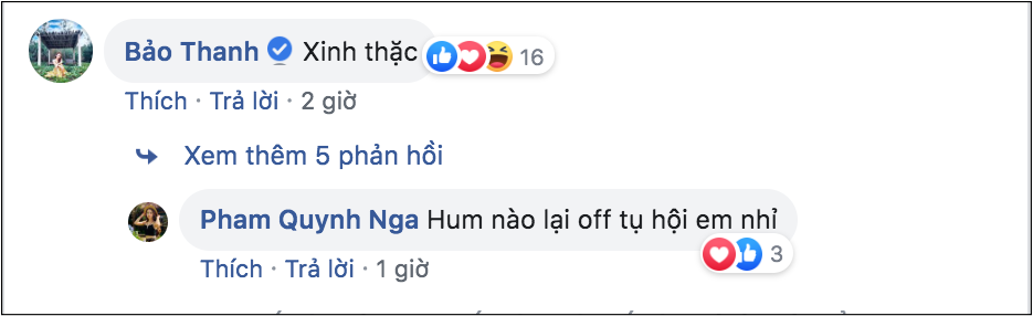 Đặc biệt, Bảo Thanh cũng không ngại để lại bình luận khen ngợi dung nhan của bạn diễn: "Xinh thật". Đáp lại, Quỳnh Nga hẹn Bảo Thanh một hôm nào đó sẽ đi tụ tập để họp hội chị em. Dòng bình luận tuy ngắn ngủi nhưng cũng đủ để nói lên mối quan hệ của hai nữ diễn viên này vô cùng tốt đẹp.
