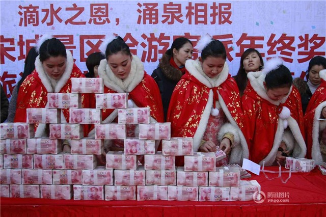 Theo mạng Sina, hôm 26/1, khu du lịch Tống Thành ở Hàng Châu đã tổ chức hoạt động tri ân khách hàng cuối năm kiểu khác người. Nhà tổ chức đã chuẩn bị 5 triệu Nhân dân tệ (17,5 tỷ VND) rồi lựa chọn 10 khách hàng may mắn.