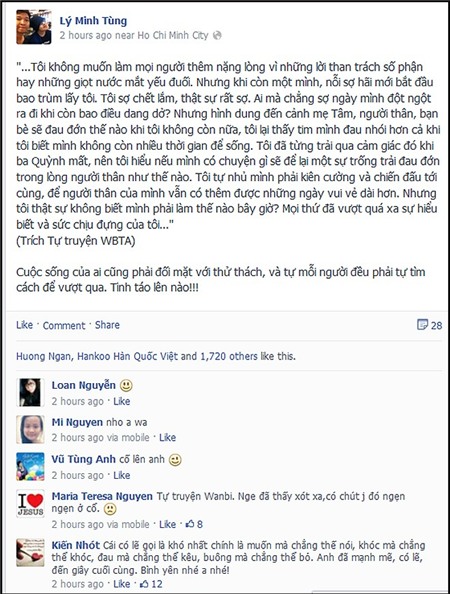 "Tôi đã từng trải qua cảm giác đó khi ba Quỳnh mất, nên tôi hiểu nếu mình có chuyện gì sẽ để lại một sự trống trải đau đớn trong lòng người thân như thế nào. Tôi tự nhủ mình phải kiên cường và chiến đấu tới cùng, để người thân của mình vẫn có thêm được những ngày vui vẻ dài hơn. Nhưng tôi thật sự không biết mình phải làm thế nào bây giờ? Mọi thứ đã vượt quá xa sự hiểu biết và sức chịu đựng của tôi...", Lý Minh Tùng chấp bút hộ cậu em trai thân thiết.