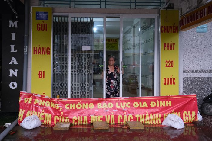 Người dân dùng tấm pano nhựa chắn trước thềm nhà để hạn chế nước tràn vào trong.