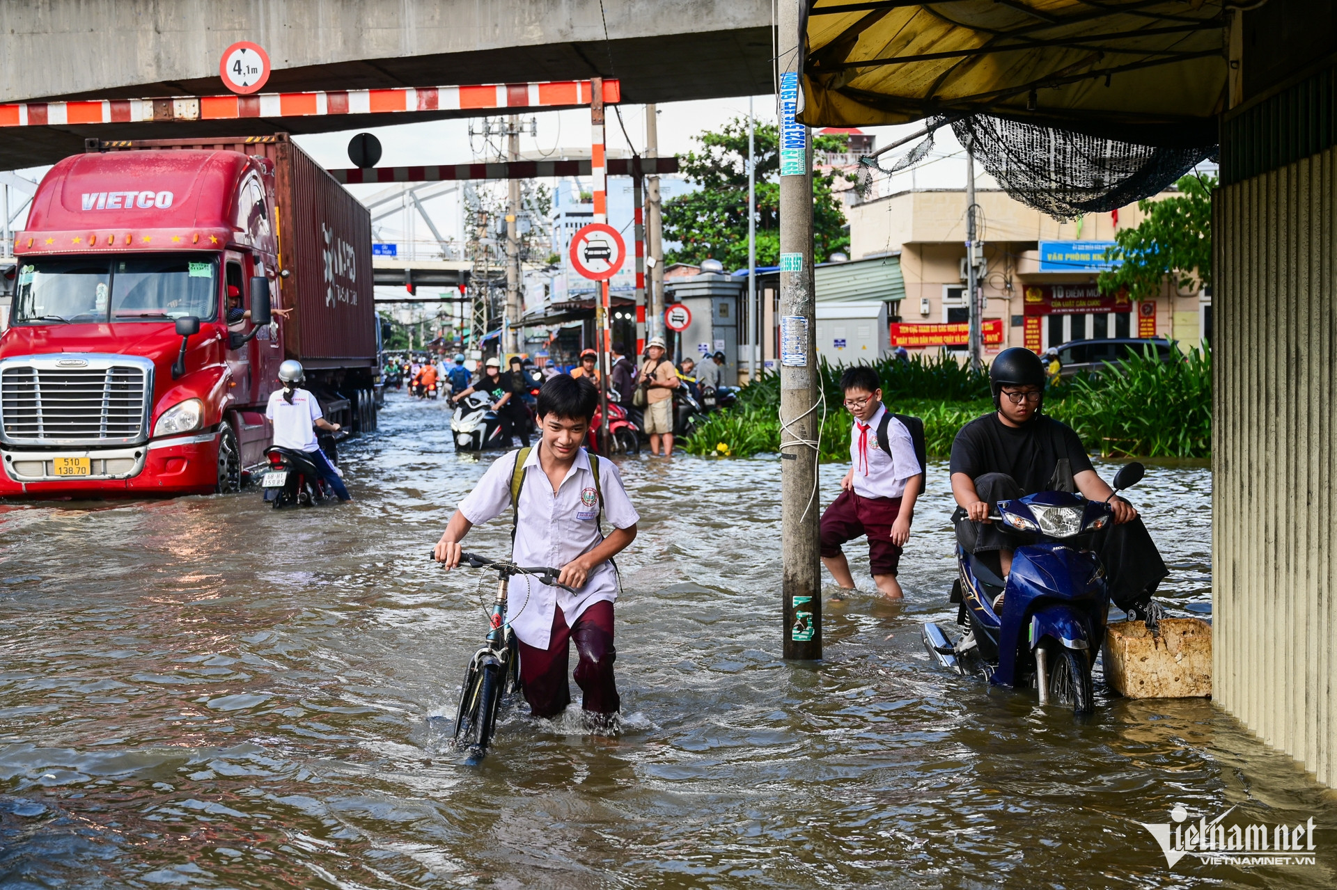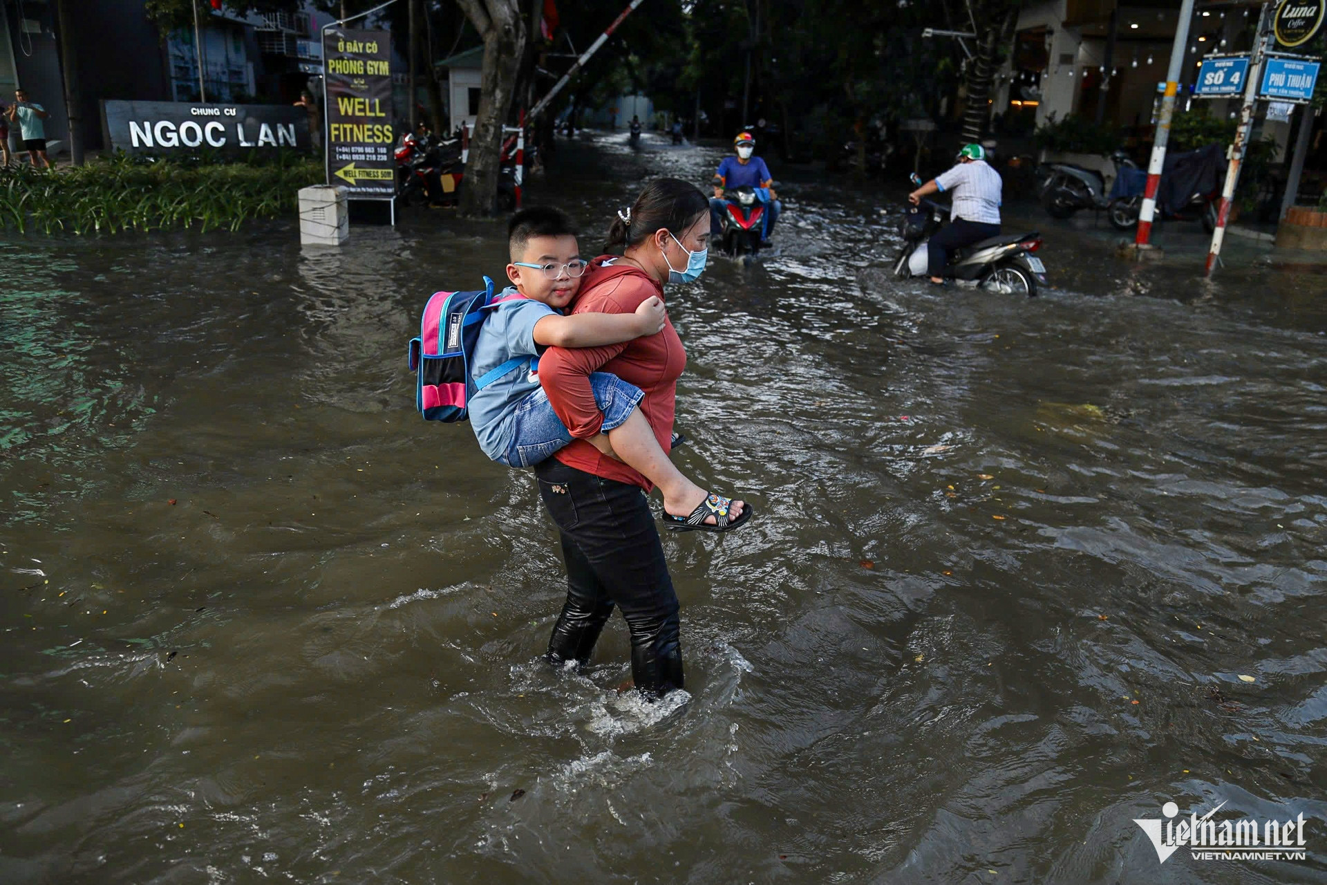 Hôm nay là ngày thứ hai liên tiếp triều cường dâng cao. Trong ảnh là chị Ánh Loan cùng 2 con đang hì hục đẩy xe khỏi đoạn ngập.