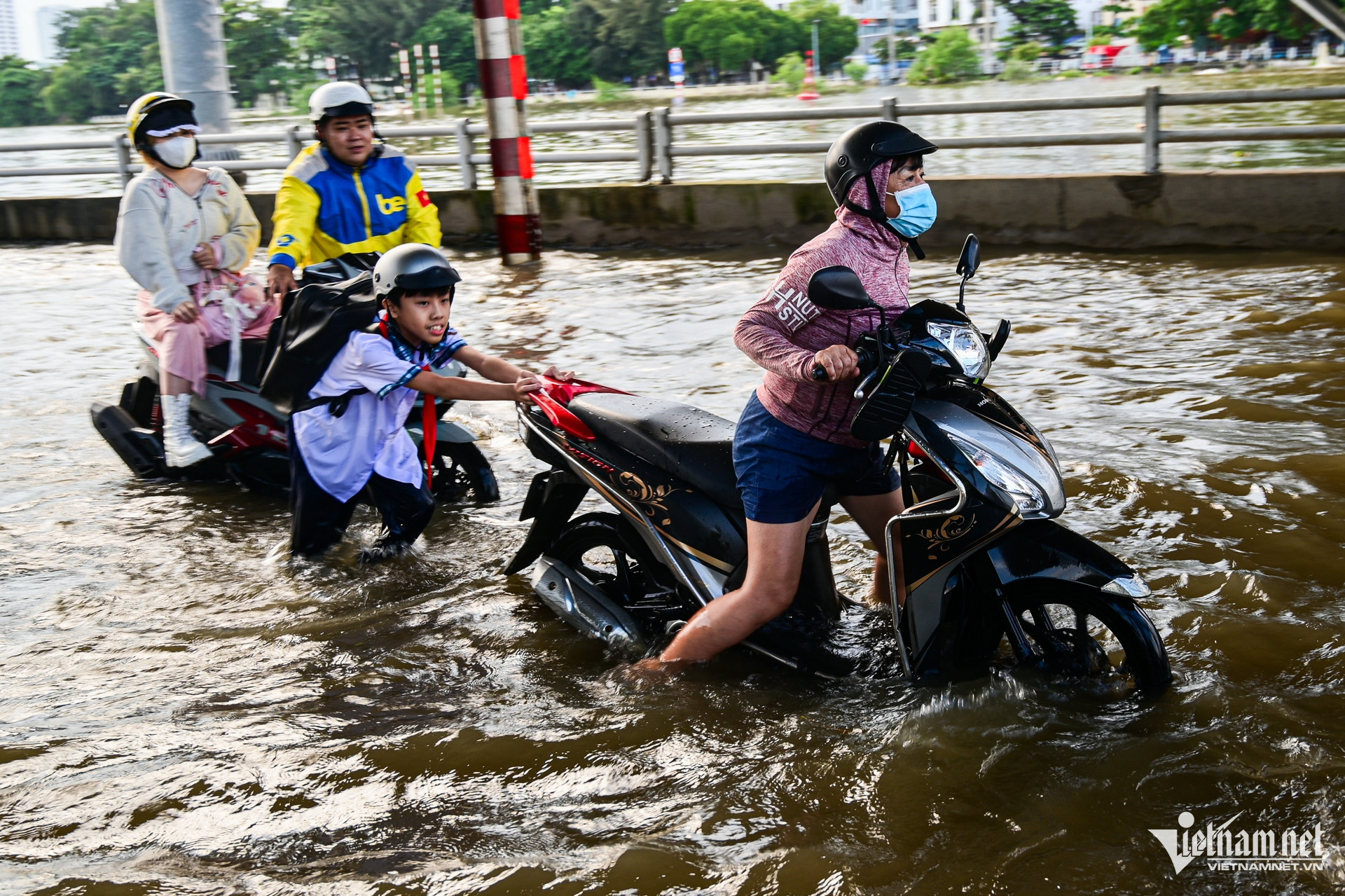 Tại một số đoạn, hàng loạt xe chết máy. Người dân bì bõm lội nước dắt xe, trong đó có cả phụ huynh đi đón con học về.