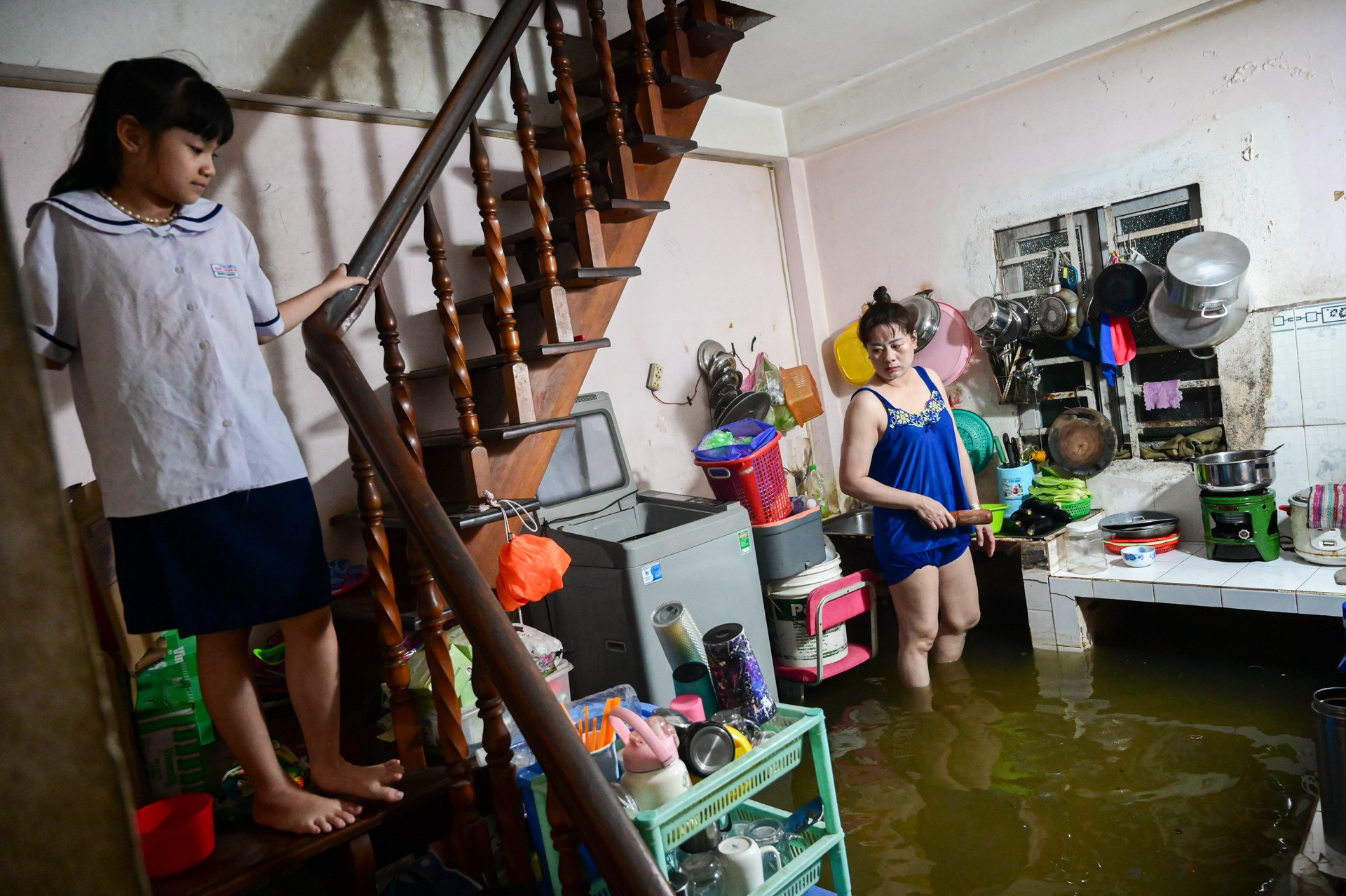 Các vật dụng, đồ đạc trong nhà chị Hạnh được kê cao để tránh nước. Với tủ lạnh hay máy giặt, gia đình chị phải ngắt luôn điện.