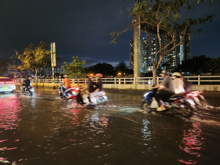 Ghi nhận lúc 19h30, triều cường dâng cao gây ngập nhiều khu vực trũng ở địa bàn quận 7, huyện Nhà Bè của TP.HCM. Nước ngập không biết đâu là đường, đâu là sông, kênh khiến người dân đi lại khó khăn.