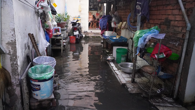 Mỗi lần ô tô chạy qua, sóng nước tràn vào nhà. "Khu vực này thường xuyên xảy ra tình trạng ngập nước. "Buổi tối thường nước lên nhiều lắm, con hẻm này từ khoảng nửa tháng nay luôn bị ngập", bà Nguyễn Thị Thanh Vân (81 tuổi, quận 7, TP.HCM) cho biết.