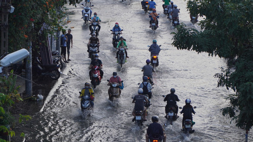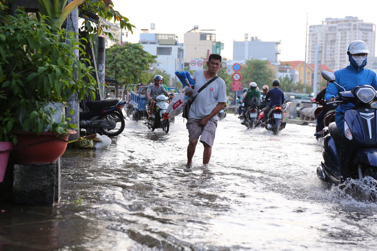 Triều cường gây ngập vào giờ tan tầm khiến người dân đi lại rất khó khăn.