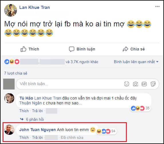 Đáng chú ý, trong khi Lan Khuê đang vất vả chứng minh tài khoản Facebook đã trở về chính chủ thì người tình tin đồn của cô - doanh nhân Tuấn John bình luận vào status này. Chỉ với 4 từ "Anh luôn tin em", đại gia Việt kiều dường như đang muốn bày tỏ tình cảm với Siêu mẫu Việt Nam 2013 một cách công khai.