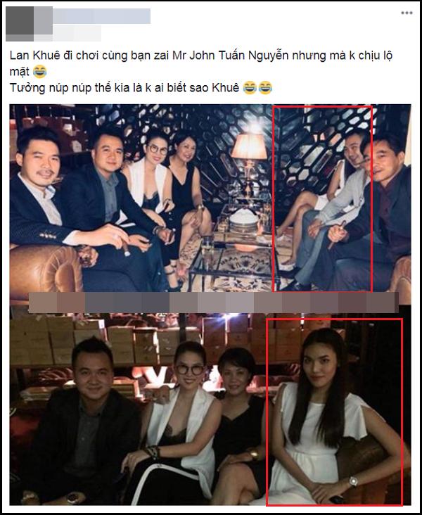 Cách đây không lâu, một fanpage chuyên đưa tin showbiz chia sẻ bức ảnh hai người đi chơi chung. Tuy nhiên, Lan Khuê chủ động nép phía sau người tình tin đồn trong bức ảnh tập thể để tránh lộ mặt.