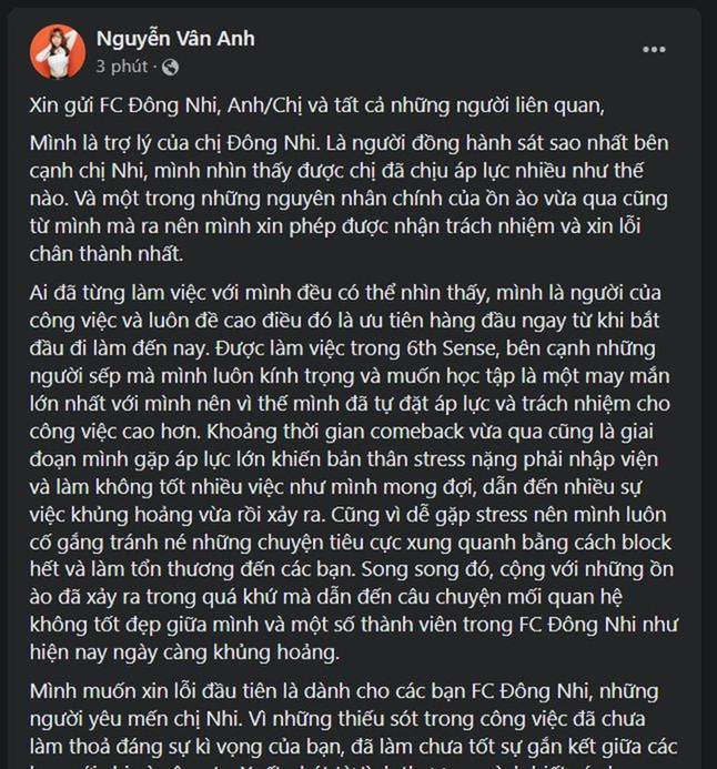 Theo đó, sáng 14/5, trên tài khoản Facebook của mình, trợ lý Đông Nhi đã đăng tải một bài viết dài gửi tới fan của nữ ca sĩ cũng như những người liên quan. Cô gửi lời xin lỗi muộn màng cũng như trần tình về sự việc gần đây.