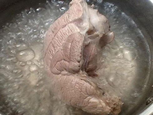 Sau đó cho cho thịt vào một nồi lước lã, luộc chín. Trong khi luộc, chị em hãy cho vào thịt một củ hành đập dập vào. Hành sẽ giúp khử mùi thịt tốt.