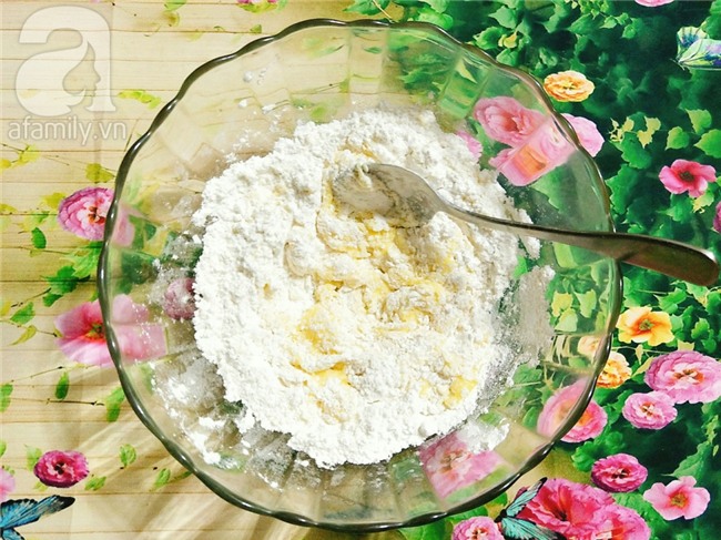 Cho bột mì, bột gạo, đường vào tô và trộn đều nguyên liệu.