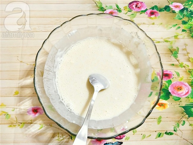 Thêm nước, trứng gà, nước cốt dừa và khuấy đều hỗn hợp cho hòa tan sau đó lọc qua rây để loại bỏ phần bột lợn cợn, để bột nghỉ 20 phút.