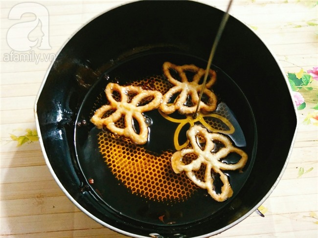 Đặt chảo dầu lên bếp đun cho dầu nóng sau đó cầm khuôn bánh nhúng vào chảo dầu khoảng 1 phút cho khuôn nóng, nhấc khuôn ra và đặt vào tô bột, không được để bột chạm vào phần trên cùng của khuôn, nhấc khuôn cho ngay vào chảo dầu chiên khoảng vài giây rồi lắc nhẹ khuôn cho bánh rời ra, chiên bánh tới khi chuyển màu vàng.