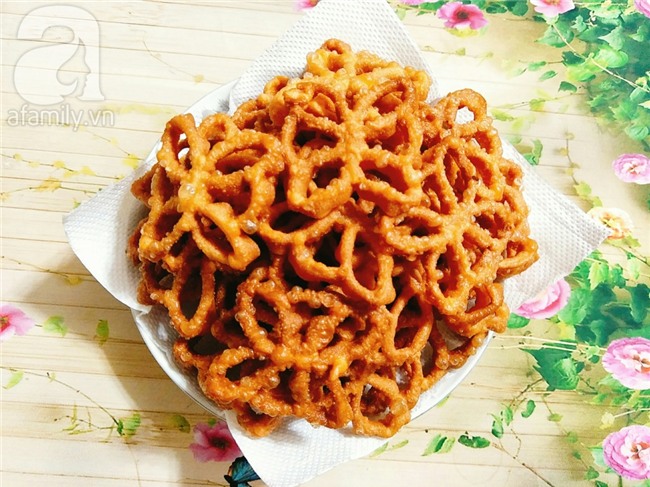 Bánh chín vàng ruộm thì vớt ra đĩa có lót sẵn giấy thấm dầu rồi làm tiếp cho hết nguyên liệu còn lại.