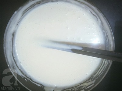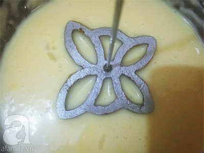 ![]() | ![]() Hoà tất cả các nguyên liệu lại với nhau. Rây qua rây để loại bỏ cặn. Bột cần có độ đặc vừa phải, không loãng quá cũng không đặc quá thì mới dễ róc khi nhúng bánh. |